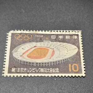 A collectible 1964 Japanese postage stamp commemorating the 18th Olympic Games in Tokyo. Features the National Stadium design, ideal for philatelists.