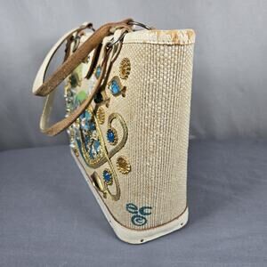 Beautiful 1966 Collins of Texas “Sea Garden” handbag featuring the iconic coastal motif with jeweled fish, floral elements, starfish, and gold-tone embellishments. This classic mid-century design includes lucite stones, rhinestones, faux pearls, and textured rope detailing over a painted sea-blue background. The signature wooden bottom, leather trim, double handles, and turn-lock closure complete the original Collins construction. Interior includes open pockets and the Collins of Texas gold logo.