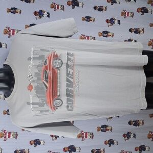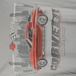 1967 American Performance Corvette Stingray car logo spellout graphic grey & red casual 2XL t-shirt is in good shape with normal wear. Good wash wear and fade. No hole's no stains, no loose threads, no peeling. pit/pit 24 length 28.5