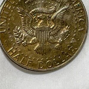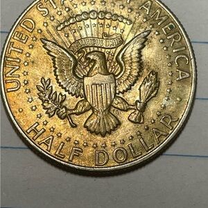1968 Kennedy Half Dollar Coin in gold and silver tones. Features the profile of John F. Kennedy.