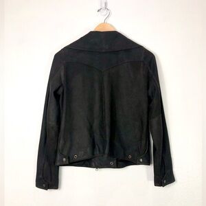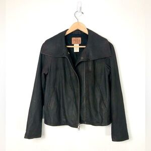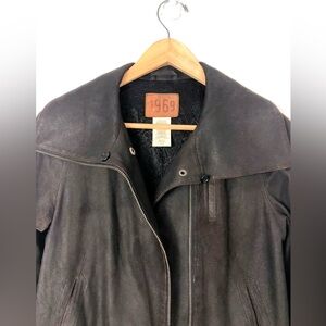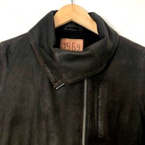 Beautiful Vintage Cow Leather Moto Jacket from 1969 Authentic Denim. Not sure how old is. Super stylish and 100% Italian Cow Leather. Some distressing to the leather. Fully lined. Color: Dark Brown. Antique gold tone snap closures. 2 pockets, 1 pocket with zipper. Full zip front up to neck. Wide collar. Adjustable snap closures at the hem. Fits: S-M. In excellent pre-owned condition.