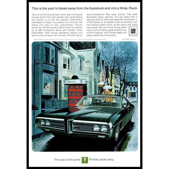 1969 Pontiac Bonneville 428 V8 Wide Track Vintage Print Ad City Street Wall Art
