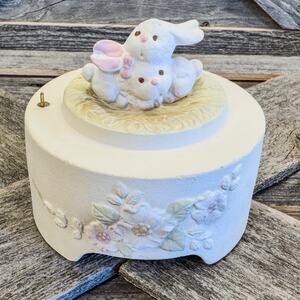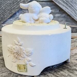 1970, Ceramic Cream Bisque Easter Bunny Music Figurine, plays “Peter Cotton Tail”.