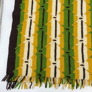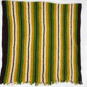 Vintage handmade long afghan lap blanket in green, off-white, dark brown, and mustard yellow stripes