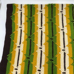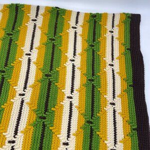1970 Crocheted Blanket Afghan Green Off-White Dark Brown Yellow Handmade Retro