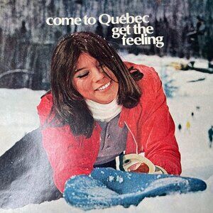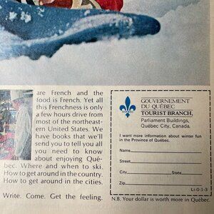 Vintage 1970 Quebec tourist print ad featuring a lady laying in snow. Perfect for collectors or home decor enthusiasts. Unique piece of history that captures the essence of 1970s advertising.