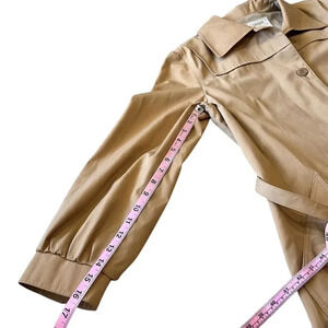 Keywords: London Fog, trench coat, women's fashion, vintage style, beige coat, belted waist, button-front, long sleeves, tailored fit, casual wear, formal wear, travel coat, workwear, pre-owned, classic trench, lined.
