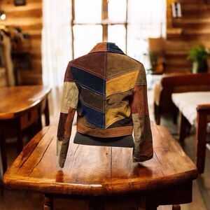 The 1970s Patch Leather Jacket in size small is a vintage piece perfect for those who embrace a boho hippie style. Made with high-quality leather, this jacket exudes a laid-back and carefree vibe that is characteristic of the era. The patchwork design and short length add to the unique and eclectic appeal of this standout piece, making it a perfect addition to any woman's wardrobe for those looking to channel their inner flower child. There is a small stain on the back and scuff mark on the sleeve and the satin liner has come undone. Pics