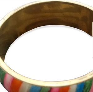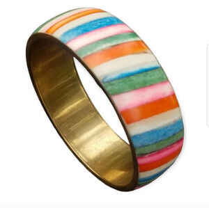 Unique bracelet from 1970s is made of brass and features dyed strips of cattle or bison bone inlayed in a lovely striped rainbow pattern. Inner circumference of bangle is 8 inches. Bracelet is in great condition