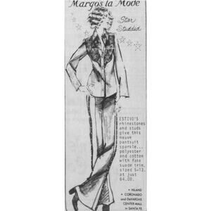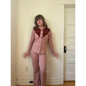 Adorable 2 piece western style pant suit in pink twill with faux suede detail on the yoke and down the side of the pants. So Dolly Parton. From 1975 on the dot.