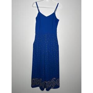 Stunning 1970s Alfred Shaheen jumpsuit set in rich royal blue with gold paisley detailing. Features a V-neck bodice with double straps, wide-leg silhouette, and hidden side zipper. Includes its original matching shawl with dramatic gold fringe — a rare complete set. 100% polyester with Shaheen’s iconic custom print. Beautiful movement and bold color. A collectible vintage piece with minimal wear for its age.