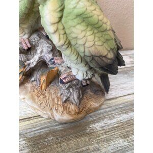 Bring a touch of tropical elegance to your home with this vintage 1970s “Cockatoos” figurine by Andrea by Sadek. This sculpture features a pair of green and cream cockatoos perched on a natural branch base with autumn-hued leaves. Each bird is intricately hand-painted with lifelike feather detailing, red crests, and expressive faces that showcase Andrea by Sadek’s signature craftsmanship.