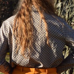 Long lose sleeved button down blouse from the 1970's. This blouse is a lrg-xlrg, it does not fit me properly, but I tried to give it some styling inspiration anyway. Would look great on someone who can properly fill it out. I feel this could be dressed up with some fun wide legged high waist pants. A great piece to play around with and in excellent condition.