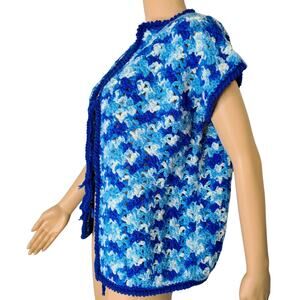 1970s Blue White Marbled Crochet Knit Cap Sleeves Tie Up Cardigan Sweater. Dark blue lined edges. Three braided tie closures run down the front. Box cut style.