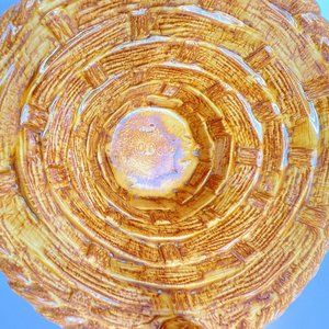 1970s Ceramic Wicker Basket Brown Yellow Twist Handle. Inside bottom has a makers mark where only the last 2 words ‘MOLD CORP’ are discernible.