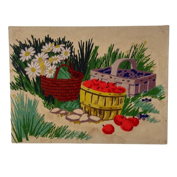 This charming 1970s crewel embroidery artwork features a colorful country scene with baskets of apples, blueberries, and daisies arranged along a garden path. The piece was stitched on a Caron printed canvas dated 1975 and showcases the rich textures, saturated colors, and nature-inspired subjects that defined the decade’s needlework style.