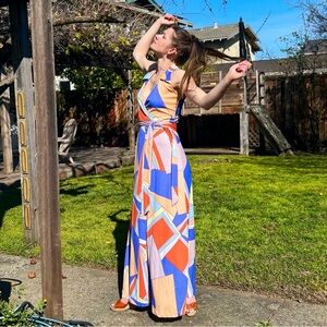 Out of this world 1970's deadstock disco maxi dress by Whip-O-Will! 100% silky soft polyester fabric in the most whimsical multicolored kaleidoscopic geometric print! Step into timeless elegance with this Vintage Maxi Dress, showcasing a captivating blend of blue and orange hues. The flowing silhouette and vibrant colors make it a standout piece for any occasion. Experience the perfect fusion of classic style and modern flair with this exquisite dress.