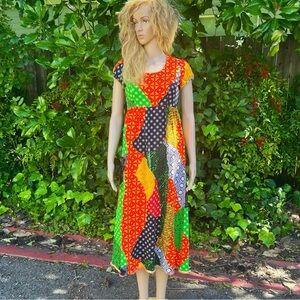 Insanely beautiful and just as well crafted, 1970s all cotton patchwork print dress by highly sought after label, Denise Are Here! Features top-notch 100% cotton fabric in a bold primary colored patchwork print, adorable cap sleeve, and raw hem.