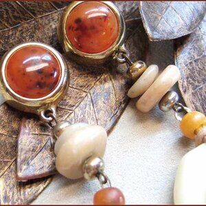 The carnelian like dome on the ear pot is made of Lucite and is framed in polished gold metal. The faux stone or marble like beads are very light weight as they are made of engineered stone. The large stone like medallion at the bottom is an ivory celluloid flower medallion. This medallion is attached with brown leather cord. There are a couple of gold metal accent beads as well.
