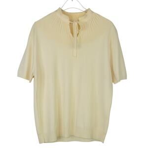 Stunning 1970s Blouse by Exmoor. ILGWU Union Made Cream Yellow Short Sleeve Knit Blouse with Pleated Collar and Neck Tie. Unique, One of a Kind Vintage Gem. See Subtle Blemishes on Back Bottom