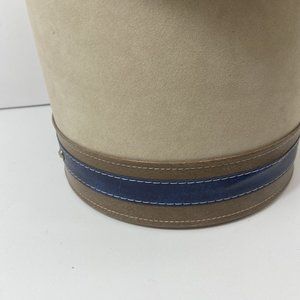 This Georges Briard large capacity ice bucket levels up your home bar. Perfect house warming gift, just add a bottle of wine, Burbon or favorite spirits. They will be excited to add this to their barware. Mid-Century Modern design with beige suede base and handle, Brown leather white stitched trim overlayed with navy blue leather trim. Brown leather trim with nob handle. Perfect piece for monogramming or designing, or perfect as is. Plastic insulated bucket to keep your ice chilled. 2 qt capacity, measures 11" tall, 18" handle, with a 8" base diameter.