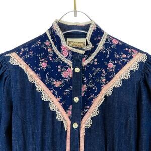 Stunning Vintage 70s Gunne Sax Dress in Blue Denim with a Calico Floral Print on Collar and Sleeves, Pink Ribbon Accents, and White Lace Trim on Bust and Hem. Ruffled, Layered Prairie Dress. High Waisted A-Line Silhouette with Long Puff Shoulder Sleeves and Back Waist Tie. High Neck with Button Up Front. Excellent Vintage Condition, See Subtle Snag Shown Near Button