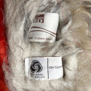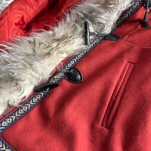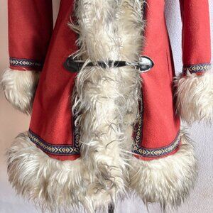 Perfectly 1970s hippie era coat in rust colored/burnt orange wool. Embroidered edging down front opening and at wrists. Fluffy wool faux-fur look collar, running down front edge and at cuffs.