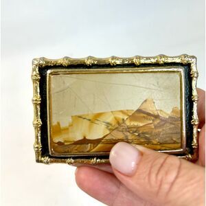 Very cool urban cowboy 70’s belt buckle by Kenneth Reid. Has some cracks in the howlite, most noticeable in the upper left corner, see closeup pic. Comes in original box with paperwork given with belt