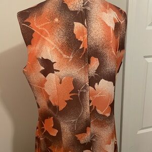 This elegant 1970s sleeveless dress features a stunning leaf print in shades of orange and brown. Classic darting on bust trim with mod fit. Perfect for any occasion, it offers both style and comfort. No tag for brand or material specifics. Beautifully made and in amazing condition!!