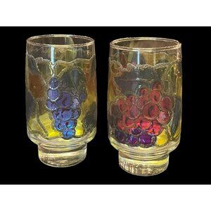 1970s Libbey Stained Glass Vineyard Red and Purple Grapes Tumbler Cups Set of 2