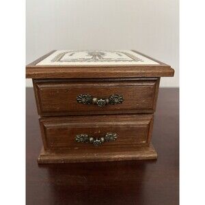 The 1970's Miss Petticoat Kids wood & tile Jewelry box is a vintage square-shaped jewelry box made from wood and tile materials. It features a brown color and velvet lining, making it a stylish and elegant storage solution for necklaces, bracelets, earrings, and more. With 2 drawers for organization, this jewelry box is perfect for keeping your precious pieces safe and tidy. Made in Taiwan, this Mele brand jewelry box is a unique addition to any jewelry collection, bringing a touch of nostalgia and charm to your jewelry care routine.