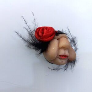 1970s Muppet "Jolie Laide" Face Pendant. Bust of Theatre Ready Lady. This figural pendant is of a lovely lady, ready for the theatre, is 1970s awesome. The lady's face features puffy cheeks, rouged lips and cheeks, a Silk Rose in her hair, which is presented as fine feathers which flow gently in wind. Her face is 21-4" wide, or 0.84 inches wide. The pendant will hand from your favorite rope or delicate chain, pressed through the supporting loop at the top rear.