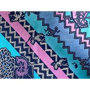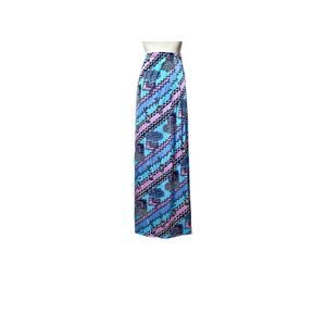 Elevate your look with a vibrant, maxi beach skirt 1970's. Featuring a bold and playful zig-zag pattern accented with dotted details and stylized lizards, this elastic waist A-line skirt brings together rich shades of teal, blue, and lavender for a colorful ensemble.
