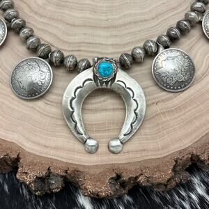 1970s Native American NAVAJO Silver Turquoise Naja Necklace Morgan Dollar Coins