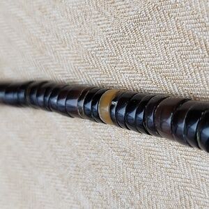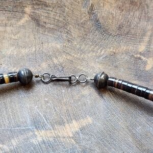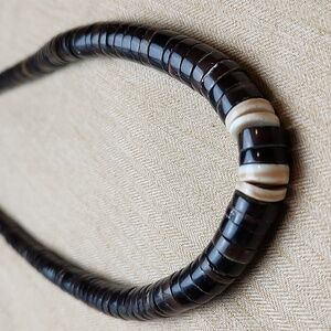 This choker necklace hails from the late 1960s to 1970s and represents a time when hand-shaped shells were made into discs and strung in simple style. The piece is made of disc heishi of dark pen or olive shell interspersed by off white clam shell heishi. The heishi discs are all hand cut--older stones that are increasingly hard to find. This Santo Domingo piece would be great gift for someone special. Unisex. Please use measured length as a size guide.