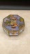 Brass encased glass with ball feet. Original sticker. The lid and clasp are loose but it’s in good condition. Mild color loss. Made in Bellmawr, N.J
