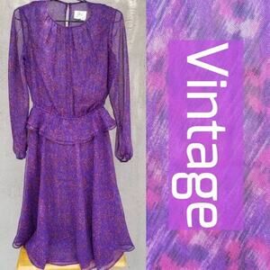 Vintage Purple Sheer Leopard Print Peplum Midi Dress Long Sleeve Size 10