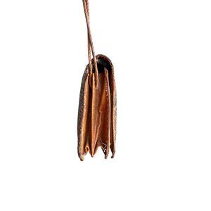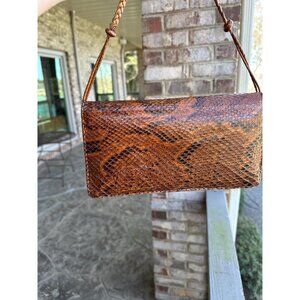 Beautiful 1970s python snakeskin bag with braided strap. It's an orange/brown color with black/dark brown markings. All hand-stitched. The inside has two large leather compartments - each have open pockets. There is also one central zippered pocket. The purse snaps shut with a snap on each corner. No maker's label or markings. It's in good condition but does have some water discoloration and spots on the inside. There are also light pen marks on the upper flap inside. There is one 1" square section on the back where the scales have lost their shine and look more matte. Otherwise, in good condition. It measures 10.5" wide, 6" tall, 2" deep when closed.
