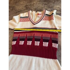 Charming vintage sweater dress with a distinct 1970s aesthetic. This cream-colored, long-sleeved dress features a flattering V-neckline and a visually appealing geometric pattern in shades of burgundy, gray, and white across the upper bodice.