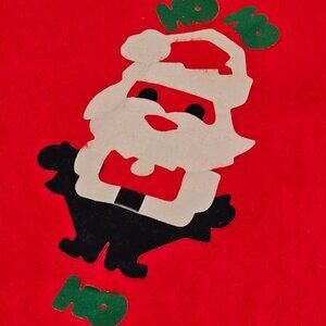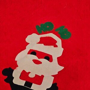 A handcrafted 1970s red tree skirt with a cheerful Santa Claus design and gold fringe detailing. Adds vintage charm to holiday decor.