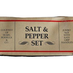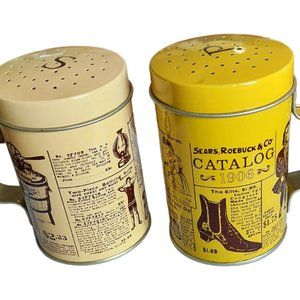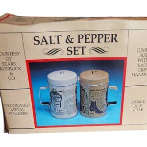 This pair of Sears, Roebuck & Co. vintage range-top style salt & pepper shakers are metal and are new in the original box (never used). They measure 3 1/4" tall X 2 1/2" diameter and have easy grip handles for ease. They have recreated Sears catalog listings on them. These were items featured in a 1970's Sears promotion recognizing 1906 when the Sears catalog plant opened in Chicago. Perfect for outdoor grilling or a great piece for a me know if you have any questions!