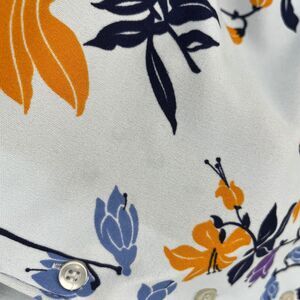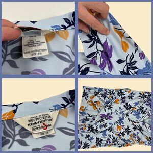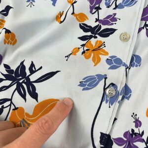 Vintage floral novelty print womens button down blouse, manufactured ca. 1970s by Sears, The Shirt. Long sleeve blouse with a collar and blue, purple, and orange flowers. Size 18.