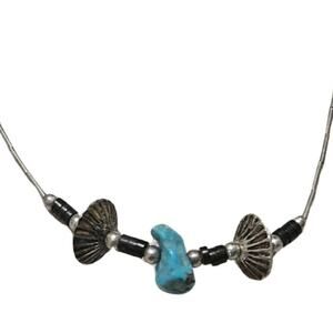1970s Sterling Silver Liquid Beads Uncut Turquoise Black Stone Necklace