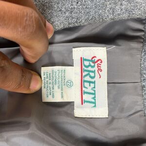 Vintage womens double breasted blazer jacket, manufactured ca. 1970s by Sue Brett. Grey coat with three front pockets, front buttons, and shoulder pads. Size 22.