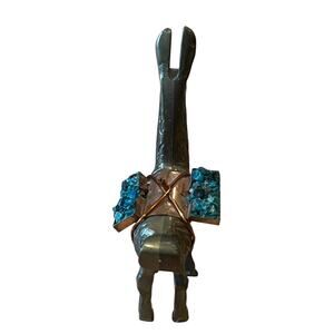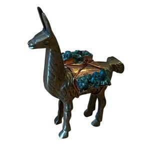 This product is a vintage 1970's brass Llama figurine with turquoise cargo packs and a copper saddle. It is a unique collectible piece that showcases intricate craftsmanship and attention to detail. The llama figure is made of brass and features colorful turquoise cargo packs, adding a pop of color to its design. The packs are slightly bent with one being a little higher than the other but hard to notice unless you’re looking for it. It measures 3.25” tall. This piece is a great addition to any collection of metalware or brass figurines, offering a charming and whimsical aesthetic that is sure to stand out.