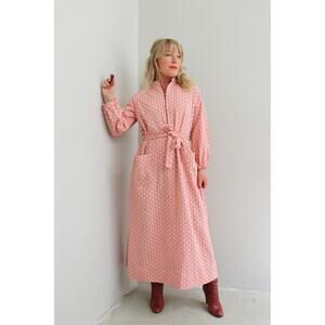 1970's Colorful day dress in women's size sm to md. Zips up the front, apron style pockets at the waist and belted waistline. Fabric is a thicker double knit polyester in bright coral pink, beige and white. In excellent vintage condition with no flaws to note.