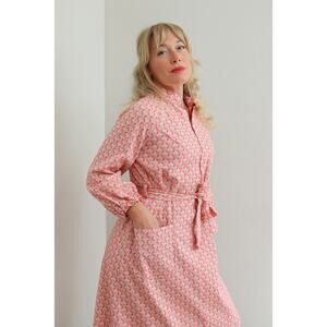 1970's Vintage Geometric Coral Day Dress ~ Women's SM MD Belted Polyester 70's