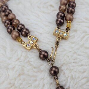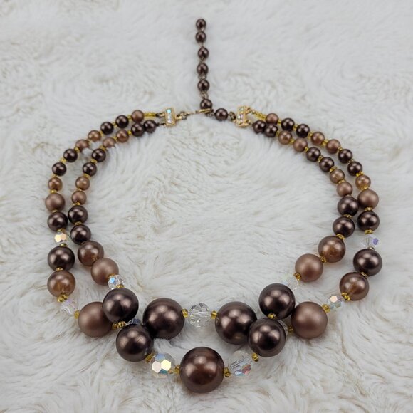 1970s Vintage Necklace with Double Strand of Brown Beads and Crystals