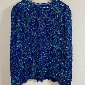 This elegant blue blouse by Niteline is adorned with shimmering sequin embellishments, creating a captivating visual appeal. The zipper and the clasp at the top in the back work beautifully. The intricate design flows seamlessly across the fabric, offering a sophisticated touch to any ensemble. Perfect for adding a hint of glamour to your wardrobe, this blouse is a versatile choice for various occasions.