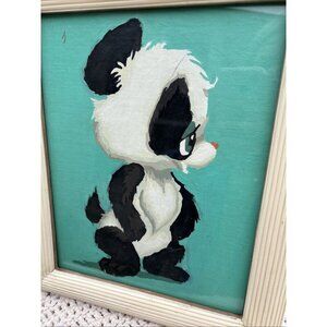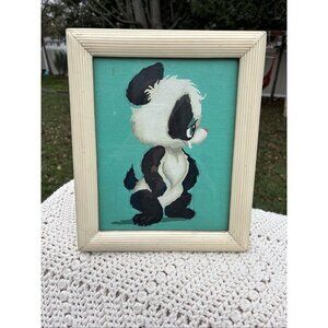 This adorable panda paint by number is a great addition to any art collection. It is a vintage piece from the 1970s and is framed for easy display. The painting features doll eyes that add a unique touch to the piece. Perfect for any panda lover or collector of vintage art.